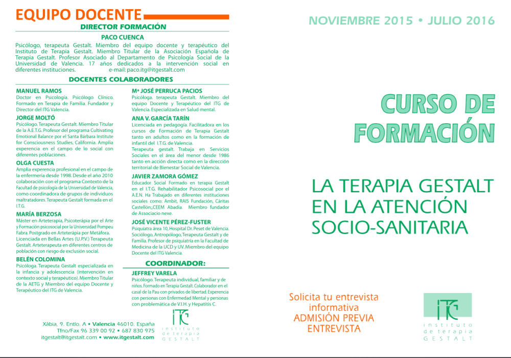 La terapia Gestalt aporta a la atención socio-sanitaria, un modelo profundo de relación, que facilita la elaboración de los procesoso complejos que ocurren entre las personas. De esta manera, la relación de ayuda y el altruismo se convierten en actitudes y disposiciones de servicio y crecimiento, elaboradas con la máxima precisión, proporcionando la prevención del burn-out, y dotando de una serie de herramientas asistenciales, en una conbinación de estructuras teóricas, metdológicas y humanas.